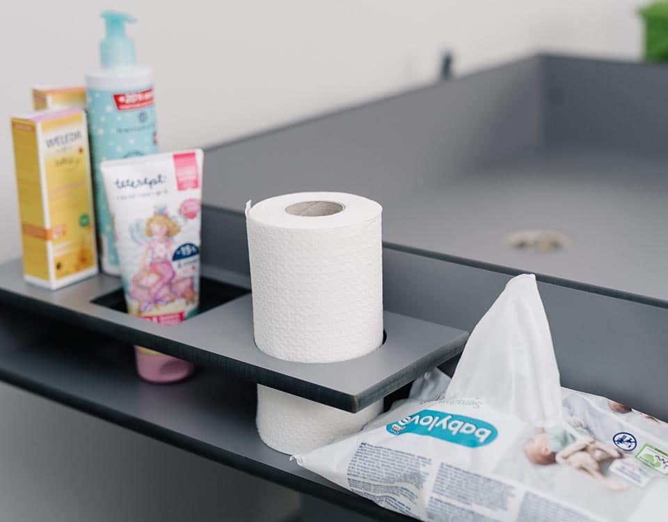 Das Konzept des Wickeltischs ist so ausgerichtet, dass Sie alles Wichtige griffbereit vor sich bzw. rund um den Wickeltisch zur Verfügung haben. So wird gewährleistet, sich nicht weit von Ihrem Kind entfernen zu müssen und Gefahr minimiert. Am Wickeltisch finden Sie Vorrichtungen für den Windeleimer, Tücher und Cremes – Sie haben ebenfalls Platz um Spielzeug zur Beschäftigung Ihres Kindes abzulegen und können alles ötige schnellstmöglich und einfach erreichen. Außerdem sind die Schübe natürlich für ausreichend Stauraum konzipiert. So unkompliziert wie möglich ist uns ein Anliegen.